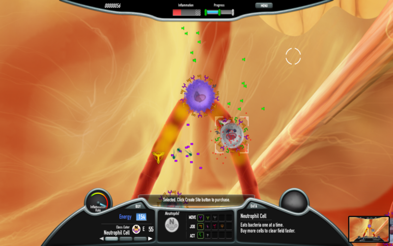 Zoomed in, we can see the state of our cells. Select cells to change their receptors, click on bacteria to see how to catch them.
